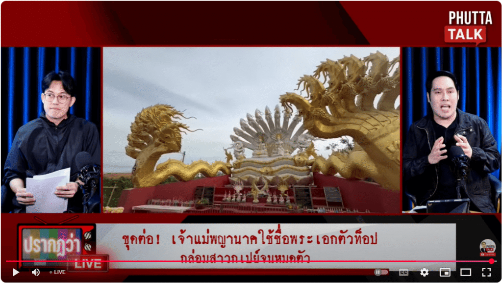 - 16:20 ดาราดังระดับแนวหน้าของไทยหลายคนได้รับการสนับสนุนทางการเงินจากสาธารณชนเป็นจำนวนมากผ่านงานบุญที่เน้นการบูชาพญานาค ซึ่งทำให้เกิดคำถามเกี่ยวกับความแท้จริงและคุณค่าของของถวายราคาแพง