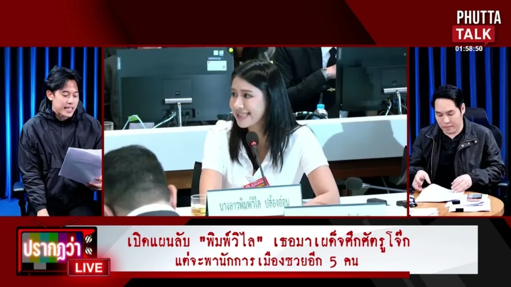 - บริบทการปรากฏตัว: พิมพ์วิไลถูกเชิญเข้ามาให้ข้อมูลต่อ คณะกรรมาธิการความมั่นคงแห่งรัฐฯ (กมธ. ชายแดน) โดยมีคุณรังสิมันต์ โรม และกรรมการคนอื่น ๆ ร่วมประชุม