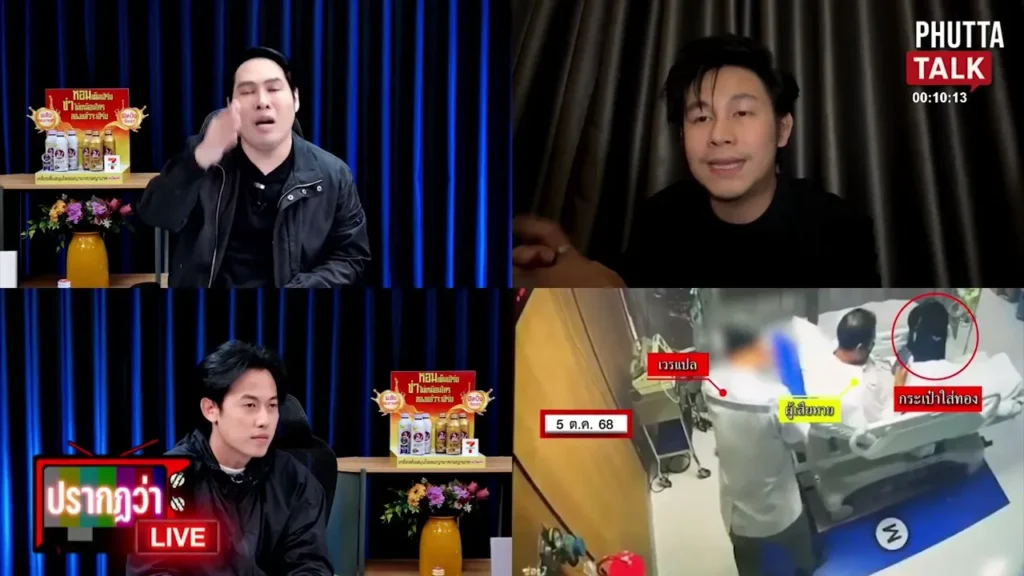 - ช่วงที่กระเป๋าถูกย้าย: เมื่อขึ้นไปพักที่ห้องผู้ป่วยพิเศษ (ชั้น 5) พยาบาลได้ย้ายกระเป๋าไปวางไว้ที่โซฟาข้างเตียง และมีการรูดม่านเพื่อเปลี่ยนชุดผู้ป่วย