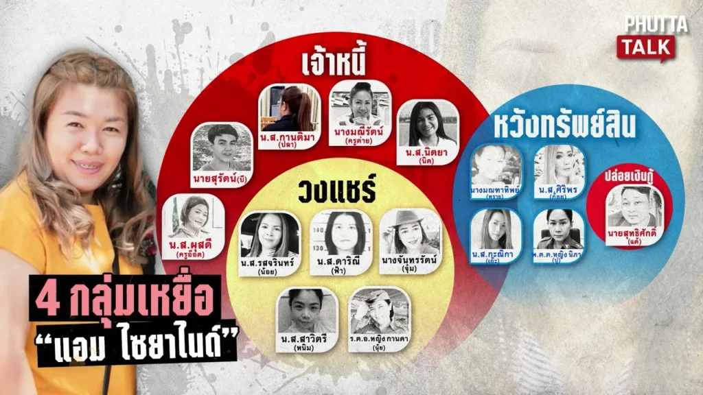 - กรณีคุณหนิม (สาวิตรี): ดาบนิติพล สามีของคุณหนิม (หนึ่งในเหยื่อ 14 ราย) เล่าว่าภรรยาเสียชีวิตหลังคลอดลูกได้เพียง 1 เดือน โดยแอมชวนลงทุนเงินกู้และติดหนี้ภรรยาอยู่ 300,000 บาท